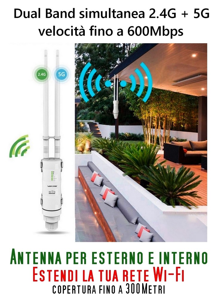 Antenna WiFi da esterno / Interno Dual Band simultanea 2.4G + 5G, velocità fino a 600Mbps.