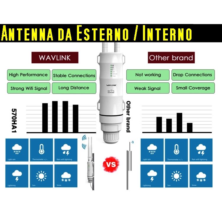 Amplificatore segnale Wifi che si può installare sia all’ esterno o all’ interno degli edifici con frequenze 2.4G e 5G a lunga distanza. Non sempre il nostro modem o router wi-fi riesce a coprire tutta l’ abitazione per poter navigare in Internet in ogni punto della casa, o magari in giardino. Per ovviare a questo inconveniente abbiamo questo nuovo ripetitore, molto più potente dei normali dispositivi WiFi, adatto sia da interno che da esterno, ottimo dove il segnale arriva a fatica. Grazie alle sue grandi antenne riuscirà a captare anche segnali deboli. Può essere montato anche all’ aperto, resistente all’ acqua e alle intemperie!