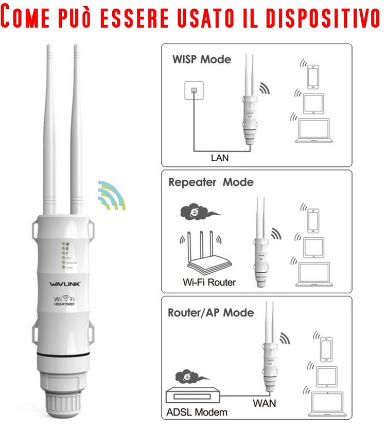 E’ necessario collegare il dispositivo ad una presa di alimentazione 220V e alla propria rete tramite cavo di rete Ethernet (allo switch, hub o router), cavo Ethernet non fornito, il dispositivo si preoccuperà di instradare tutto il traffico dei suoi client verso la rete via cavo, consentendo una copertura fino a 300 Metri teorici (in aria libera) dal punto ove installato.