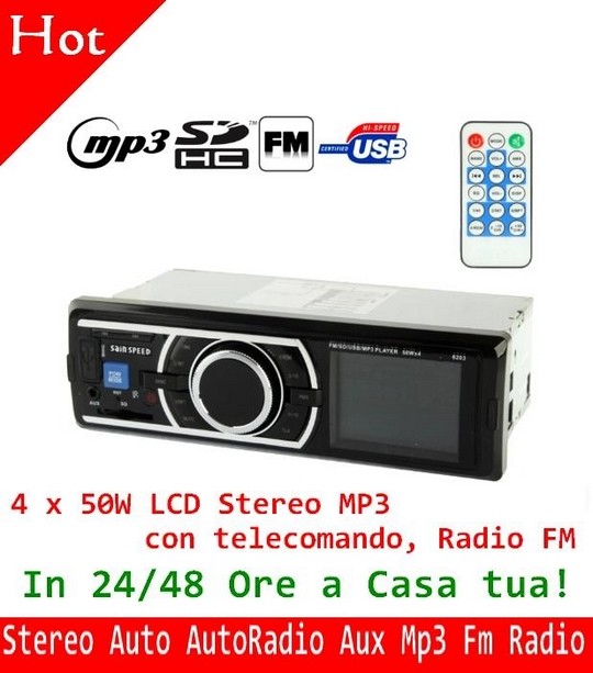Autoradio con Usb, Sd, Aux, Mp3, Radio FM. Questo stupendo Autoradio ti permette di ascoltare tutti i tuoi brani da semplici chiavette USB e SD/MMC card, ingresso Aux o dalla tradizionale Radio FM.