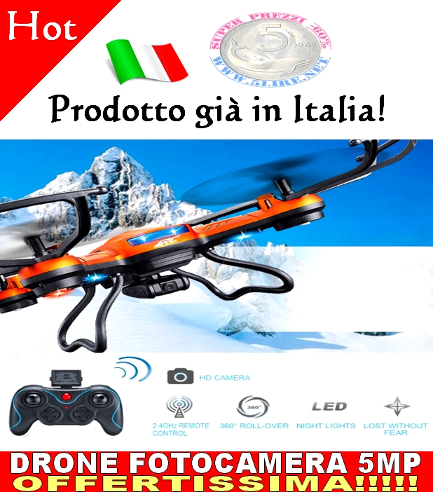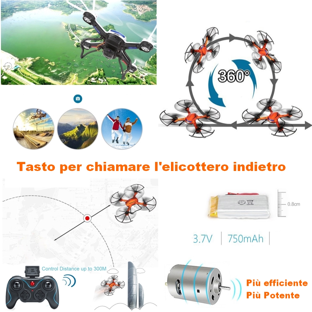 Drone con telecamera 5 Megapixel Quadricottero, vola fino a 300 metri per riprese aeree spettacolari, dotato di funzione auto-ritorno!