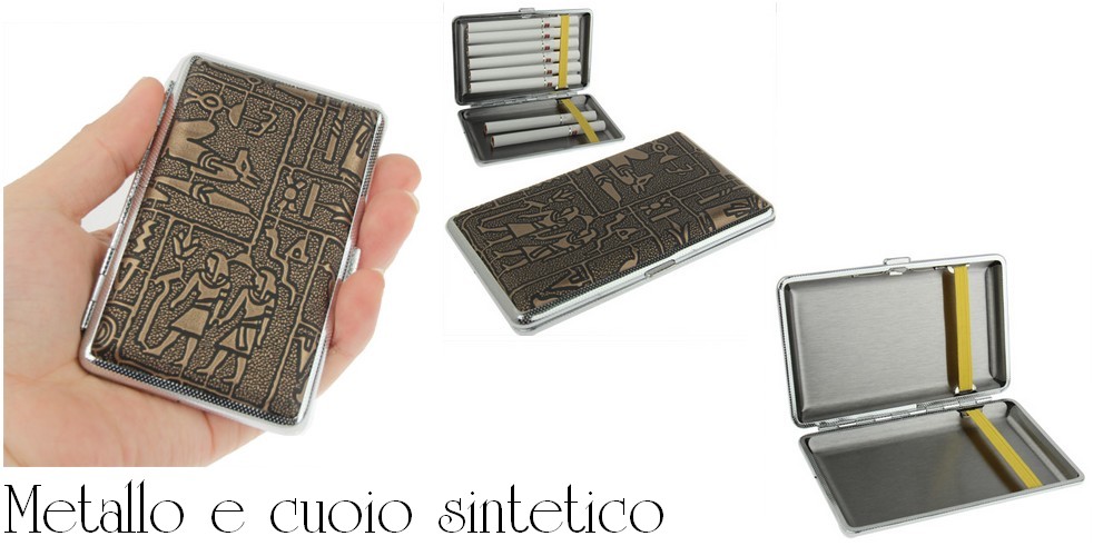 – Case portasigarette in metallo con la parte anteriore e posteriore realizzata in cuoio sintetico.