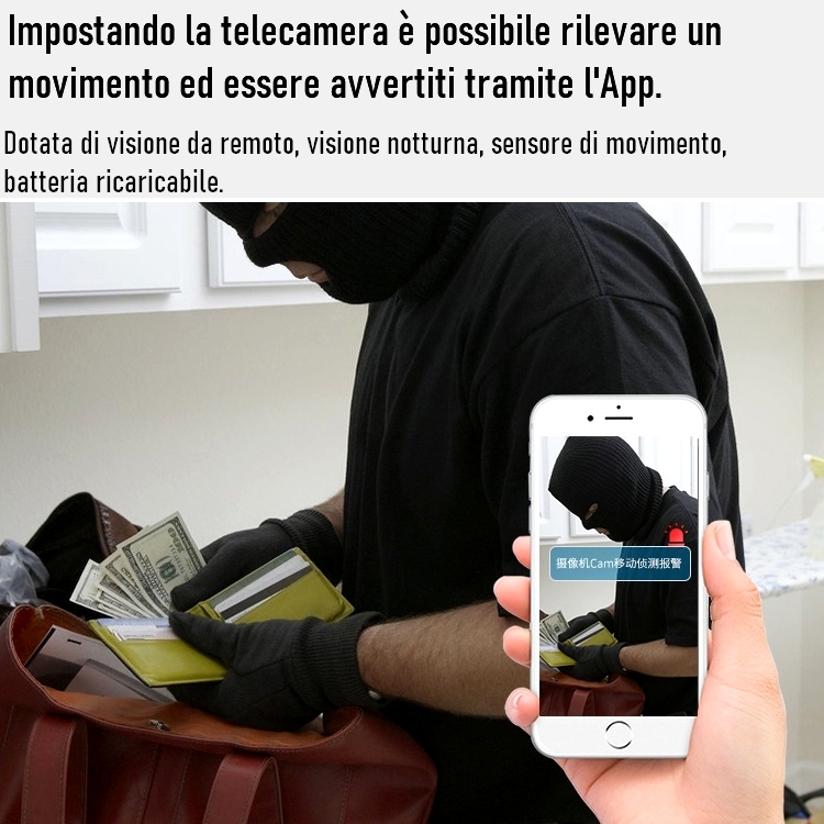 L’allarme di rilevamento del movimento può essere abilitato 24 ore al giorno. Tramite L’APP sul cellulare si possono ricevere notifiche per visualizzare in tempo reale quello che succede in diretta. ( Per usufruire di questa opzione la videocamera deve essere connessa ad Internet ).